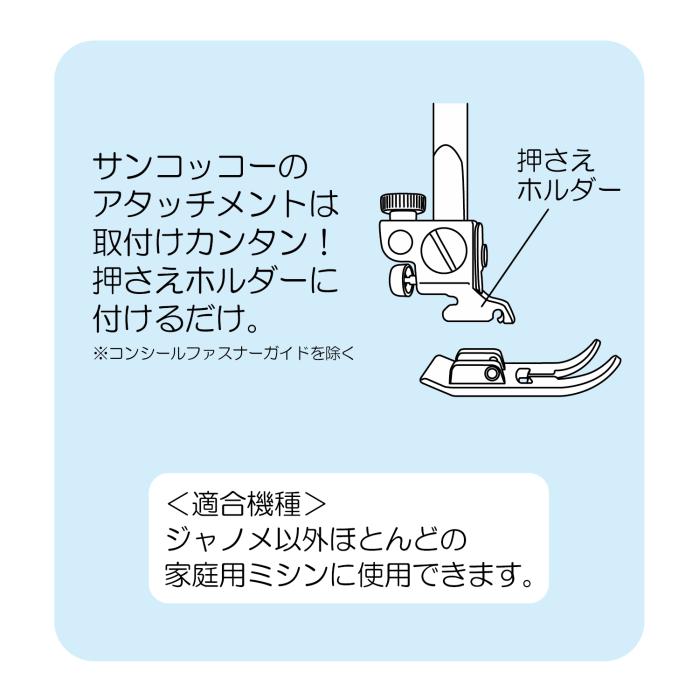 ■ご購入前にご確認ください■商品説明サンコッコーのミシンアタッチメントは押さえホルダーに付けるだけなので取付けカンタン。