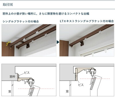 LTエキストラシングルブラケットで ドレープカーテンを吊り、レース側のレールは窓枠内 に天井付けすることで解決できます。