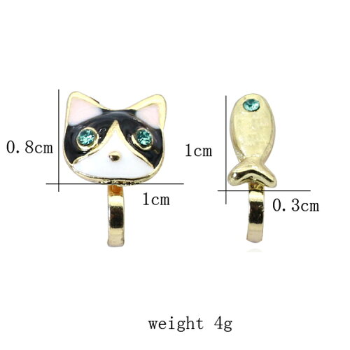 白黒の猫と目にラインストーをセットした魚のイヤリングをセットにしたユニークなノンホールピアス。